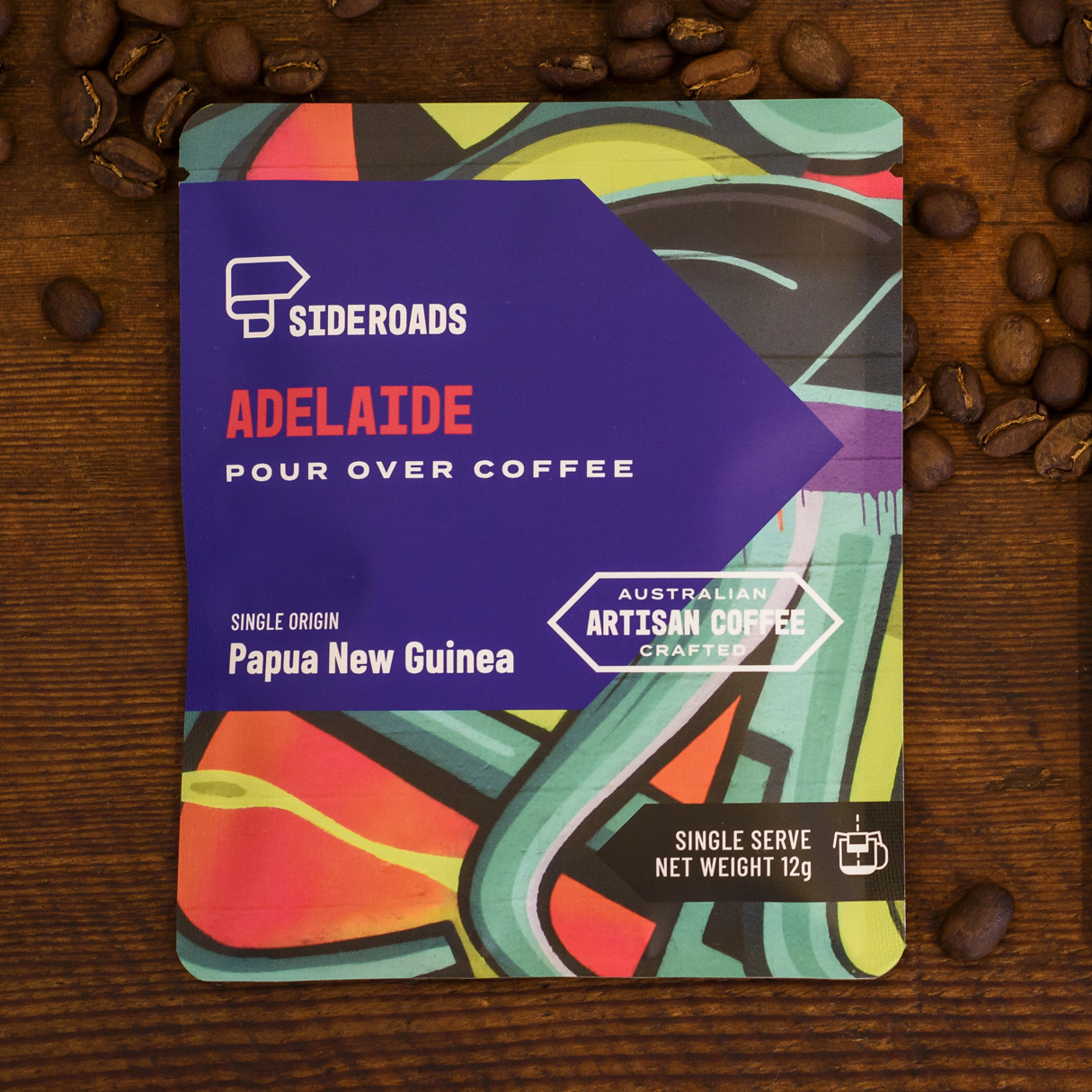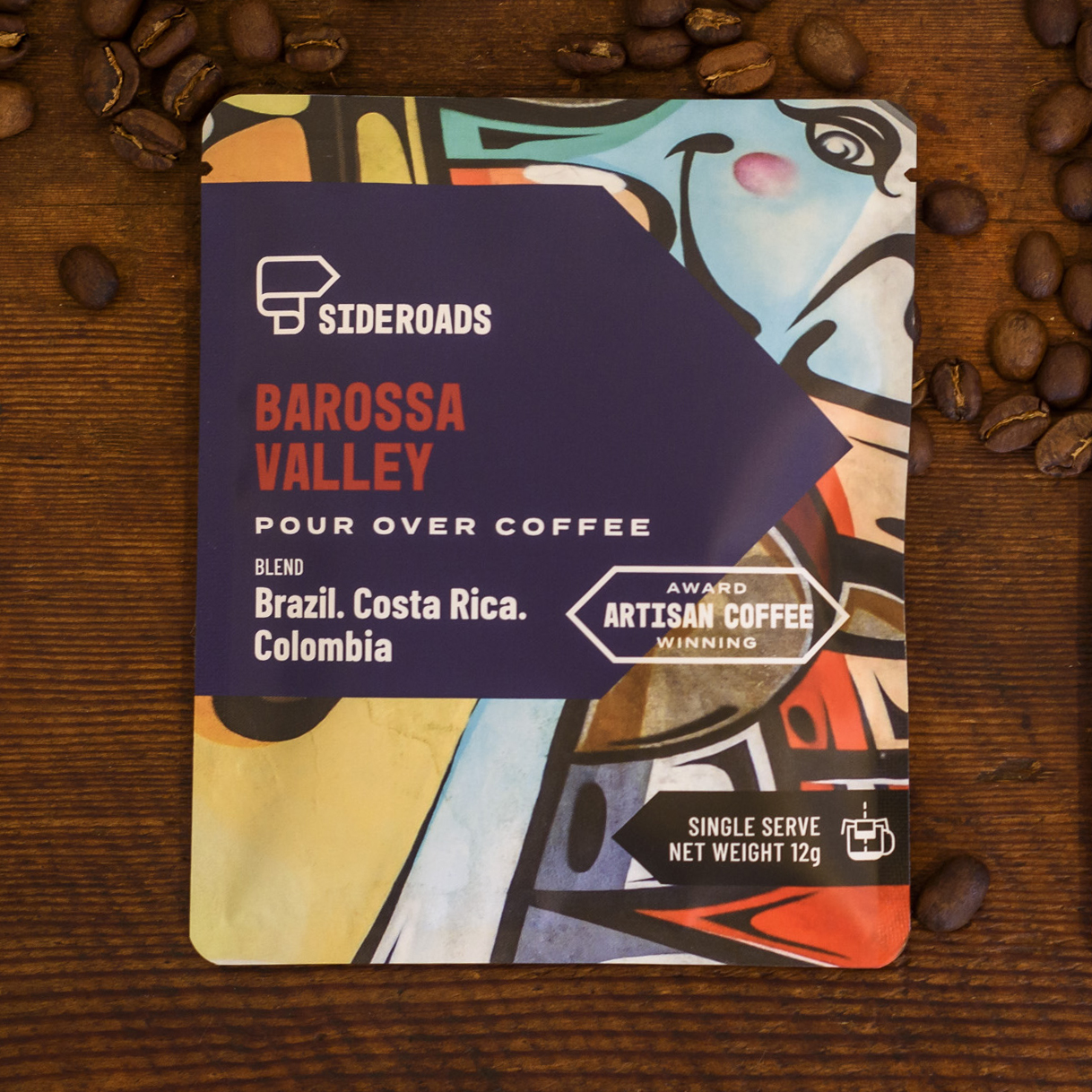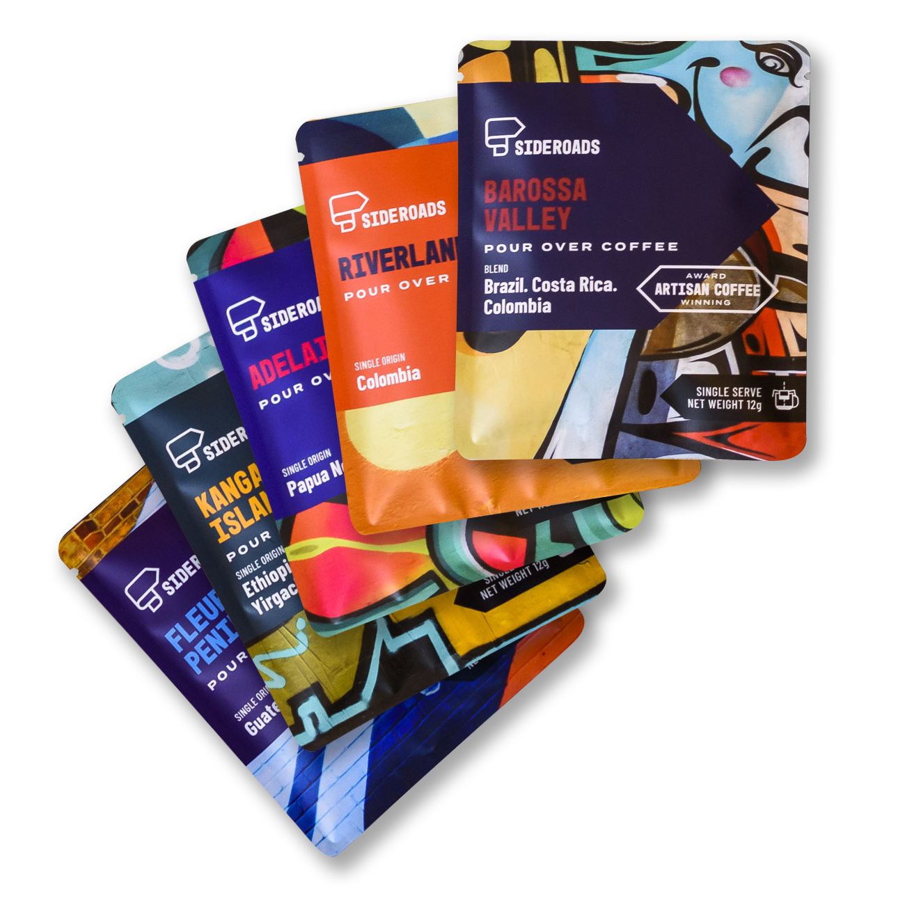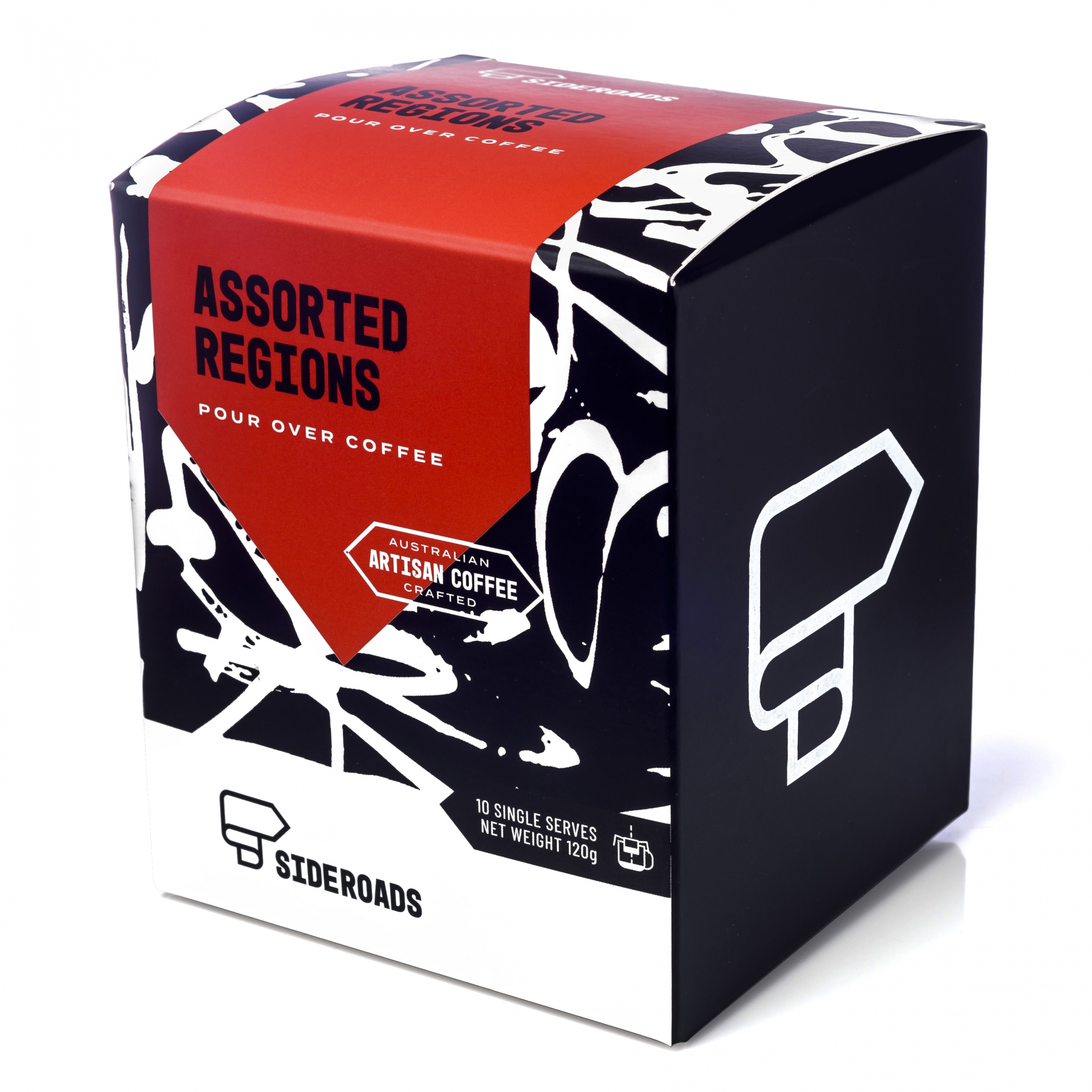 Box of 10 x 12g single serve ‘hook over cup’ pour over coffee sachets. Each single serve is individually packaged.